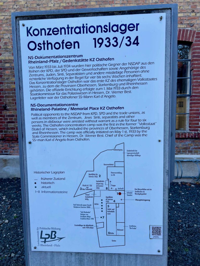 Am 03.11.2024 haben wir die KZ Gedenkstätte Osthofen besucht und nahmen an einer zweistündigen Führung teil. Das KZ wurde schon 1933 in einer Fabrikhalle eingerichtet, die einem jüdischen Besitzer gehörte. Er wurde unter falschem Vorwand enteignet. Das KZ Osthofen diente zur Abschreckung von politisch andersdenkenden Männern und Juden. Dies erreichten die Nationalsozialisten durch schlechte die Versorgung und mangelnde Unterbringung der Gefangenen. Die Folge davon war, dass die Menschen aus der Umgebung ihre Meinung nicht mehr laut äußerten. Erschreckend war für uns, dass diese Maschinerie der Abschreckung schon ganz früh eingesetzt hat und sehr akribisch geplant und ausgeführt wurde.