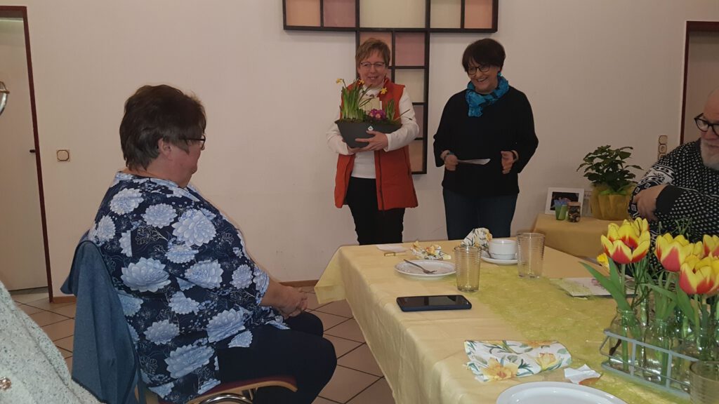 Als Dankeschön für ihre 20jährige Verantwortlichkeit und die Einladung zu diesem wunderschönen Abend überreichten im Namen Aller Marlies Theiß und Sonja Schmidt einen Gutschein und ein Frühlingsarrangement an Edelgard Hollinger.