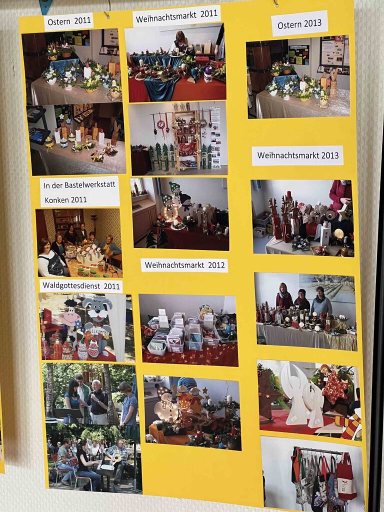Im Februar 2006 wurde im Zusammenhang mit den Gemeindewochen „40 Tage leben mit Vision“ die Idee der Bastelwerkstatt geboren. Durch die Initiative von Edelgard Hollinger hatten sich am Abschlusstag 12 Frauen spontan zur Mitarbeit gefunden. Henny Zastrau stellte die Räumlichkeiten zur Verfügung und so konnten die Bastelnachmittage nach kurzer Zeit starten. Nach wenigen Jahren wechselte die Bastelwerkstatt nach Konken in die Räume bei Doris und Axel Benner, wo noch heute die kreativen Werke entstehen. Herzlichen Dank für diese Bereitschaft.