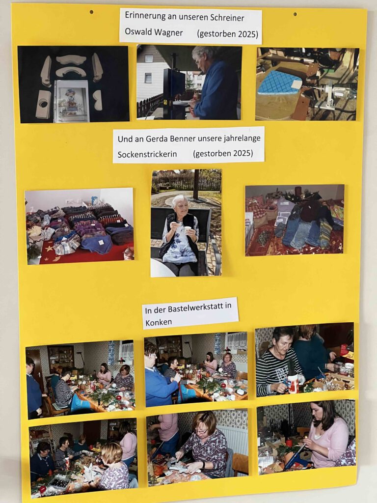 Unterstützung erhalten wir durch etliche Heimwerker. Zu nennen wären da vor allem Henny Zastrau, die seit 20 Jahren die hochwertigen Näharbeiten fertigt. Die zahlreichen Holzteile wurden lange Zeit von Oswald Wagner fachmännisch ausgesägt, seit ein paar Jahren hat diese wertvolle Tätigkeit Heinz Niebergall übernommen und sie wird von ihm bis heute ausgeführt. Als kunstvolle Socken-Strickerin hatte uns Gerda Benner jahrelang kräftig unterstützt und unsere Verkaufstische durch ihre handgestrickten Socken aufgewertet. Sie und Oswald Wagner sind im letzten Jahr leider verstorben.