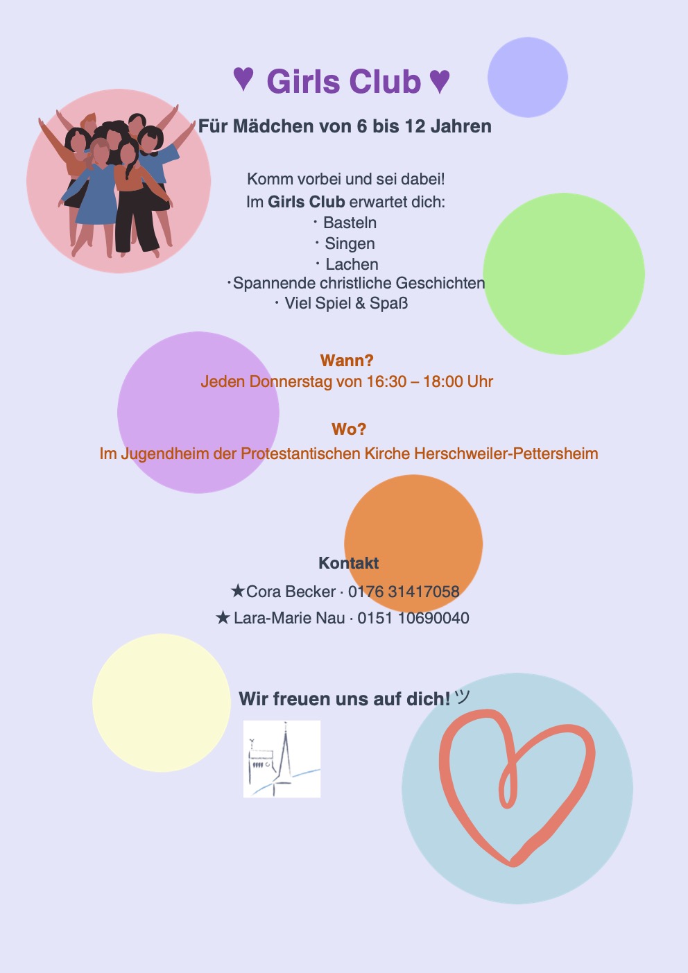 Im Girls-Club wollen wir Mädchen durch Spiel und Spaß für Gott begeistern. Wir singen, lachen, spielen, kochen und essen gemeinsam. Im Zentrum von alldem steht unser Glaube an Jesus Christus, der den Mädchen im Alter von 6-12 Jahren spielerisch durch Geschichten nahegebracht wird. Wir treffen uns immer am Donnerstag von 16:30 Uhr – 18:00 Uhr im Jugendheim Herschweiler-Pettersheim.