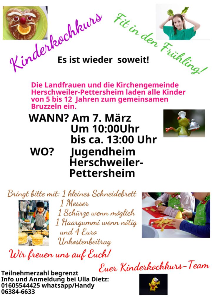 Die Landfrauen und die Kirchengemeinde Herschweiler-Pettersheim laden alle Kinder von 5 bis 12 Jahren herzlich zum gemeinsamen Bruzzeln ein. Unter dem Motto „Fit in den Frühling“ wollen wir zusammen leckere, frische Gerichte zubereiten und dabei jede Menge Spaß in der Küche haben.